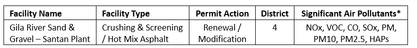 The Gila River Indian Community (GRIC) Department of Environmental Quality (DEQ) is announcing the 30-day public comment period for an air quality operating permit for the following facility: